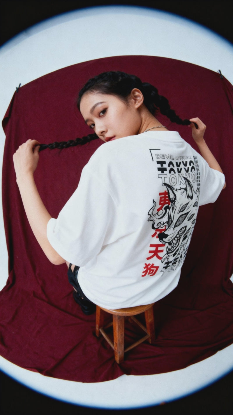 Accompanied by the embroidered phrase "Kon" in Japanese, this tee explores the weight of words that summon devils.
