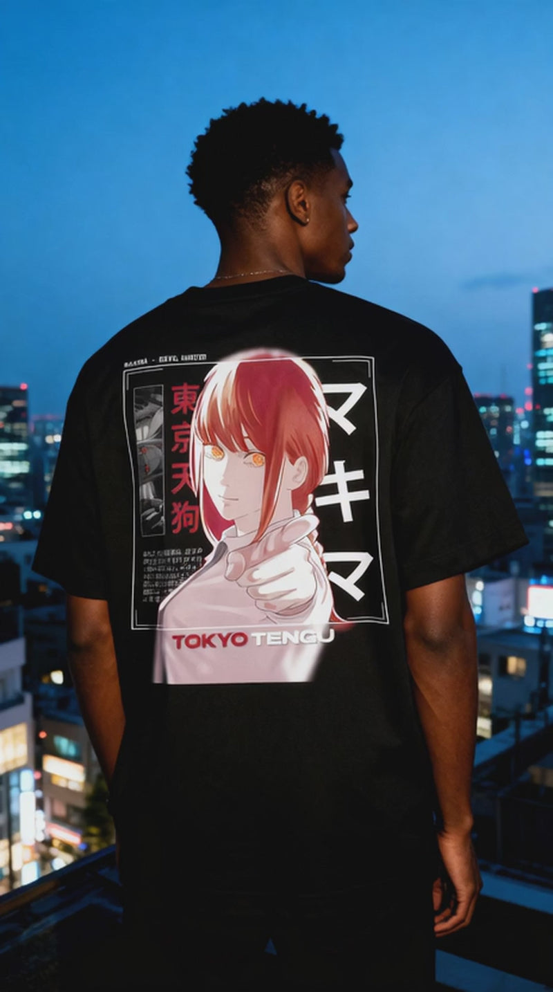Back printed, this tee showcases Makima in her calculated serenity. This design draws inspiration from Fujimoto's genius for making evil look beautiful: